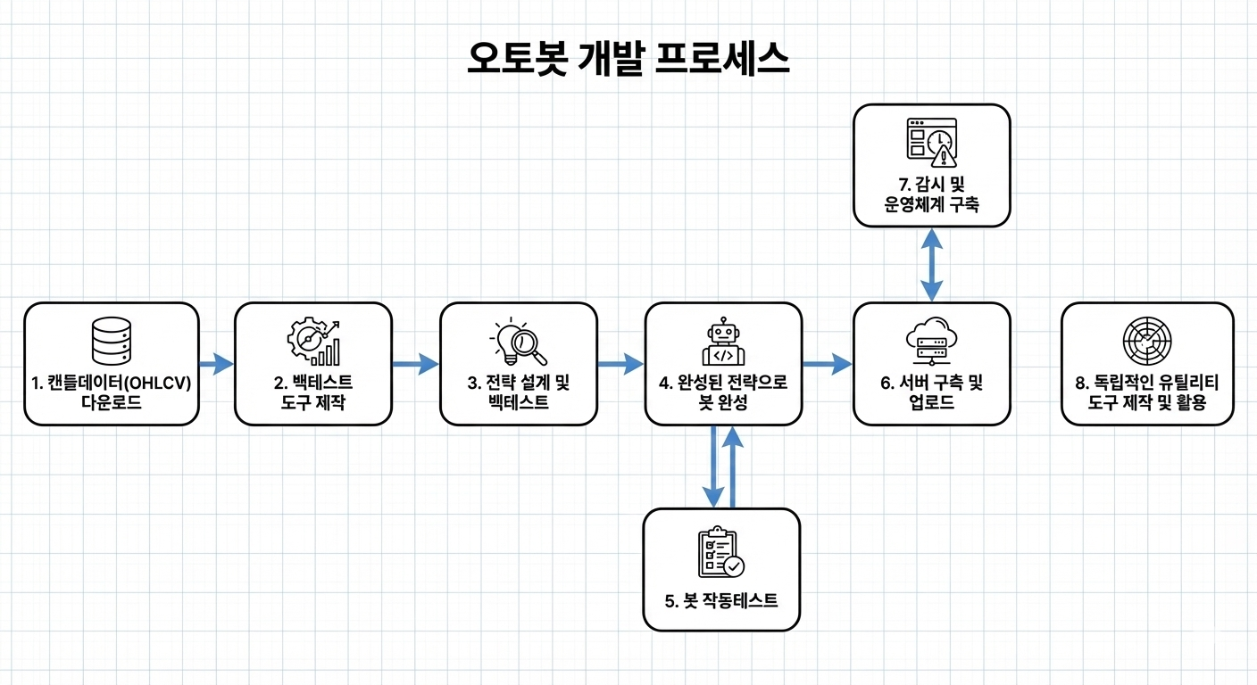 오토봇을 만들기 위한 과정은 단순한 자동매매 소프트웨어를 만드는 것을 넘어, 전략 수립부터 서버 배포, 데이터 신뢰성 확보, 장기적 운용까지 다양한 고민이 필요합니다. 다음은 오토봇 개발을 직접 해본 경험을 토대로 정리한 실제 절차와 핵심 고려사항입니다.